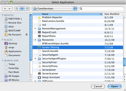 Navigate to the /System/Library/CoreServices and select Screen Sharing.